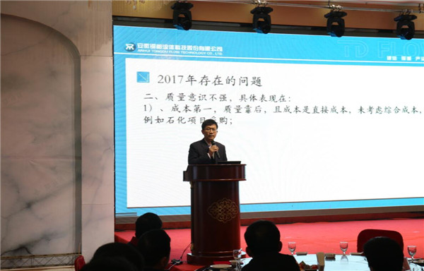 年会上,公司副总经理杨凌杰作2017年度营销工作报告, 公司总经理赵小虎对2017年度工作作了全面总结,充分肯定了公司近三年来各项核心指标均实现两位数增长的成绩,指出了目前管理工作中存在的不足,提出了具体改进措施,并明确了2018年核心经营目标。公司董事长杨成结合行业及公司当前发展趋势,从公司长远发展、做大做强战略高度,深刻分析了铜都流体面临严峻的挑战形势,并指明企业的发展策略以及发展措施,并号召全体员工不忘初心,继续发力,使铜都流体新年再上新台阶。