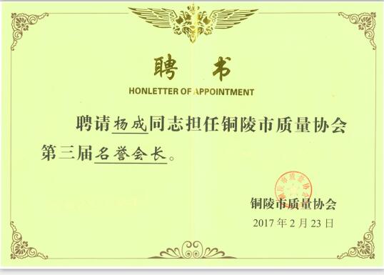 2017年2月末市质量协会聘请董事长杨成先生,担任铜陵市质量协会第三届名誉会