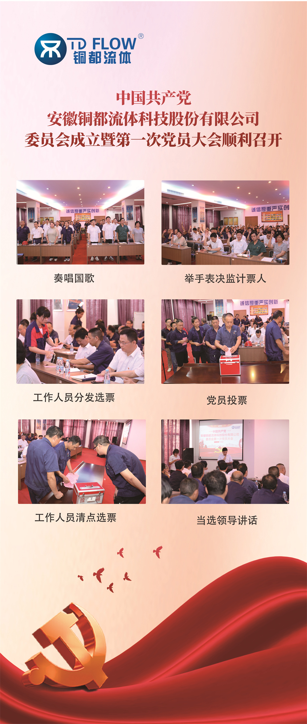 日前,经中共铜陵市狮子山高新区党工委批准,中国共产党安徽铜都流体科技股份有限公司委员会正式成立。9月28日,铜都流体党委召开了一次党员大会,选举产生了铜都流体党委书记、副书记、委员和各支部书记。