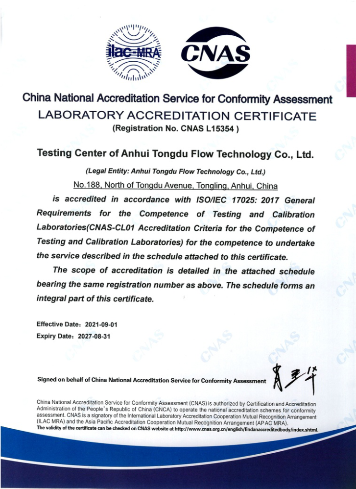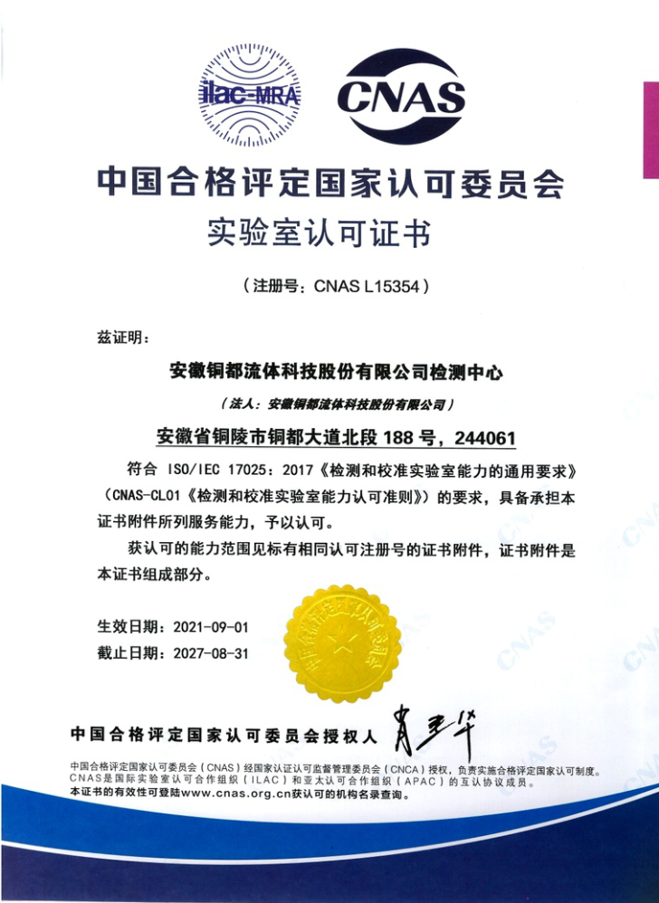安徽铜都流体科技股份有限公司于近日获得“中国合格评定国家认可委员会(CNAS)实验室认可证书”。