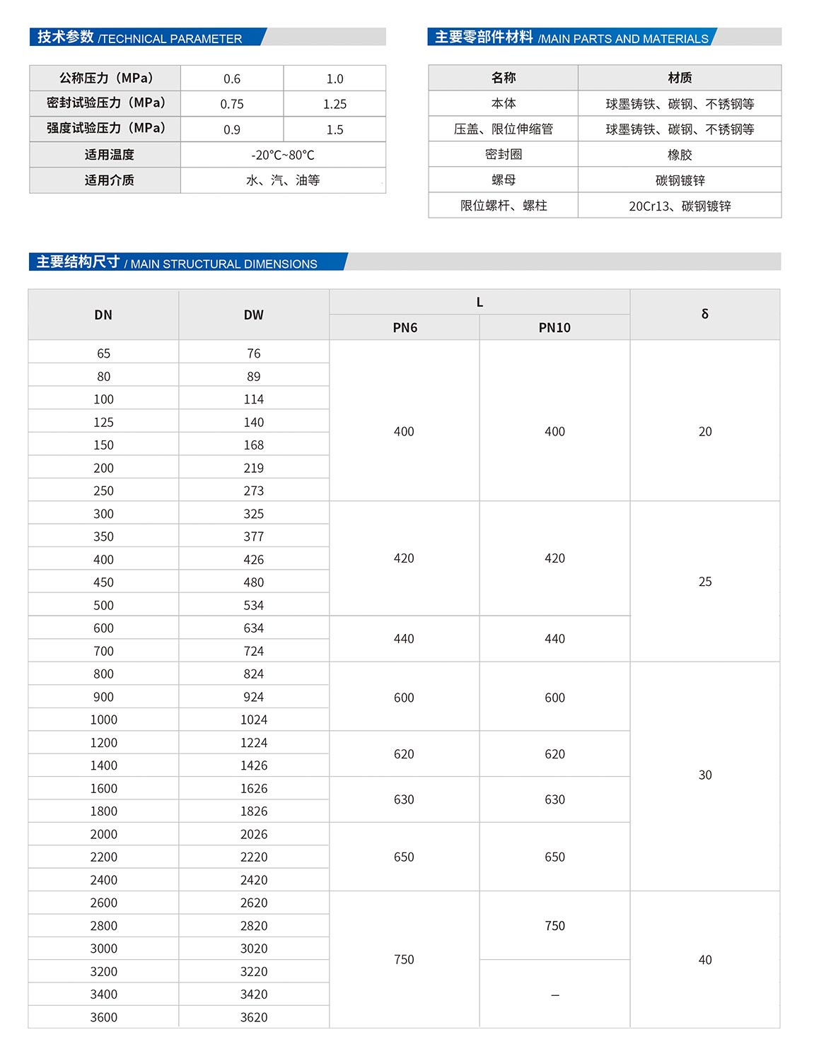 双法兰传力接头:由本体,密封圈,压盖,伸缩短管等主要部件组成。该产品适用于两边均为法兰连接的管道中,安装时调节产品两端的法兰的安装长度,对角均匀拧紧压盖螺栓,使其成为一个整体,并有一定的调节量,方便安装维修时,根据现场尺寸进行调整。在工作时可以反轴向推力传递至整个管道。双法兰传力接头是由法兰松套伸缩接头和短管法兰,传力螺杆等构件组成,能降低被连接件的压力推力(盲板力)和补偿管路安装误差。双法兰传力接主要用于泵、阀门等附件的松套连接。