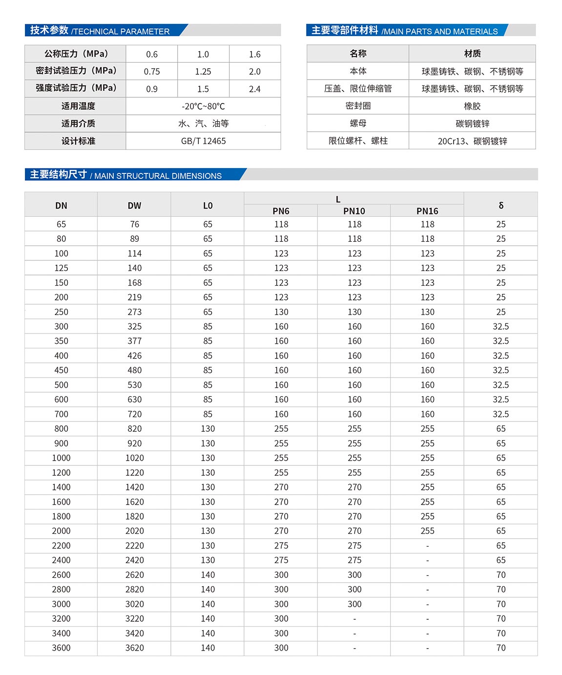 松套限位补偿接头安装在管道上后,拧紧螺母,起到密封和连接作用。当温度变化时,管子能在接头中间自由地伸缩,当地基下沉、偏斜,它均能确保密封无渗漏,从而达到自动补偿之目的。