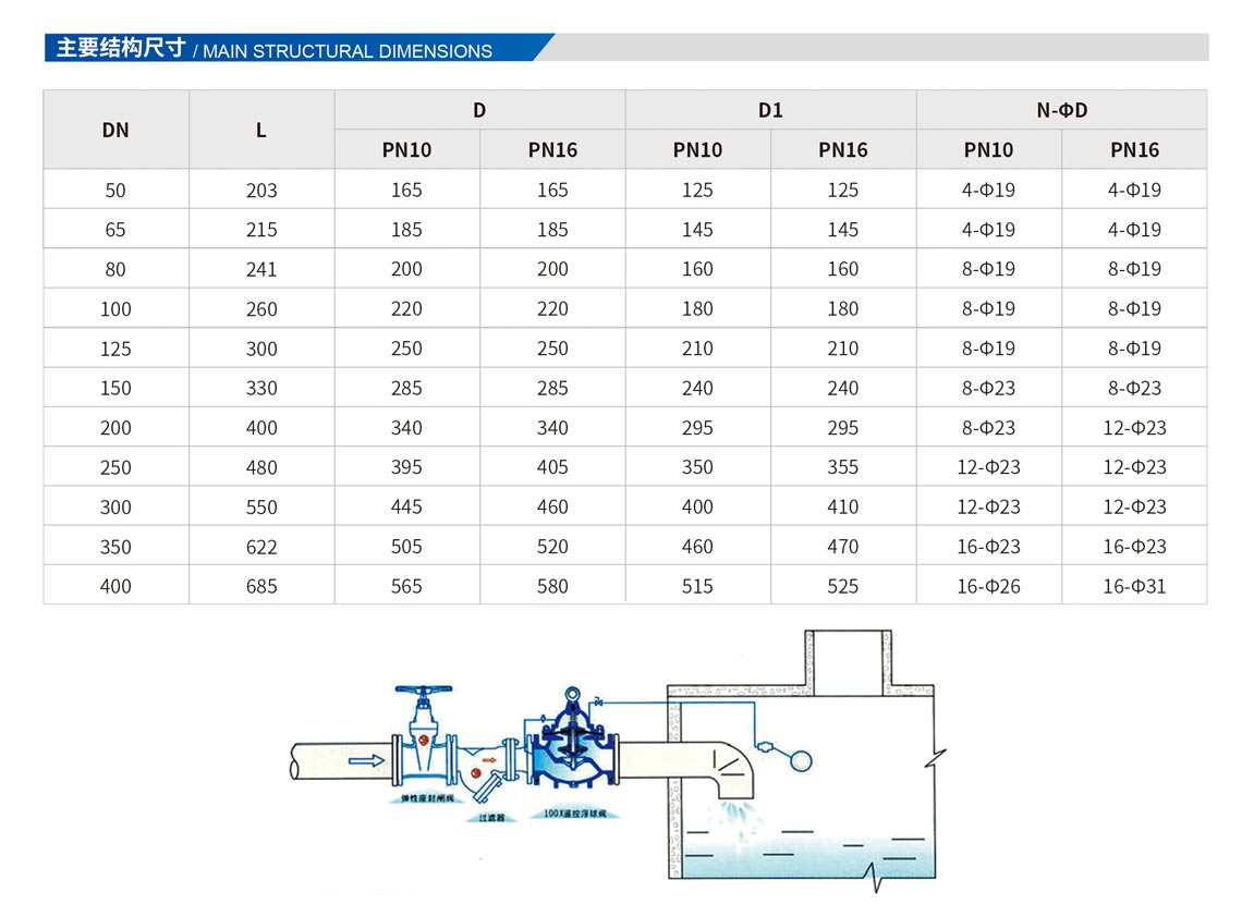 该阀门能有效地控制水塔或水箱液面,适时切断或打开阀芯输入水充或阻止水流外泄。液位控制准,水位不受压力波动干扰,开团紧密不漏水,浮球灵活,维护保养简单(控制球阀可与主阀分离安装),适用于工矿,企业,高层建筑中的水箱,水池,水塔的自动供水系统。