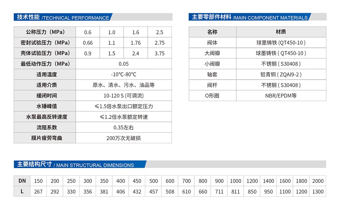 4、安装在水泵出口管道上,具有关阀启泵、关阀停泵(停泵无水锤)、非人为意外停泵时防止水锤破坏等功能,关闭时间可调。
