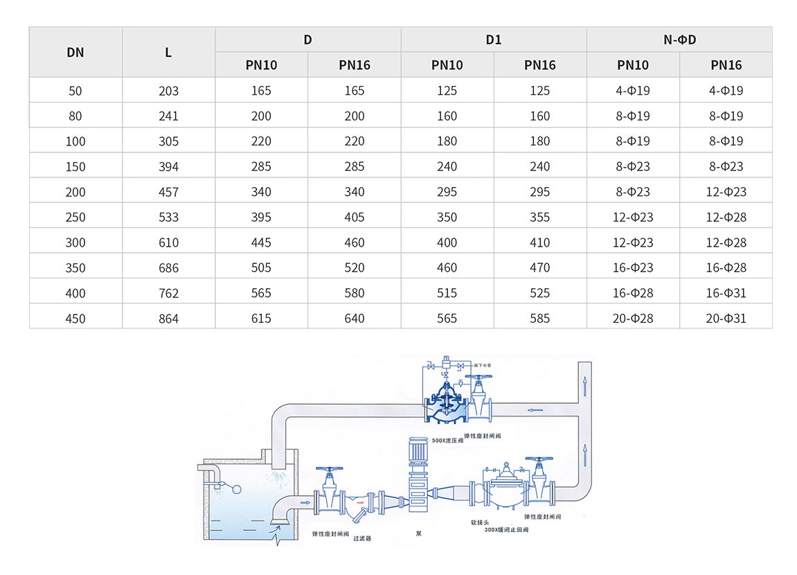 500X泄压/持压阀主要用于消防或其他供水系统中,以防止系统超压或维持消防供水系统的压力。消防泵关闭后还可以减小水锤的冲击。也用于大型供水系统的水锤消除装置,并且阀门控制系统的进口处装有一个自清洁滤网,利用流体特性,使比重较大、直径较大的悬浮颗粒不会进入控制系统,确保系统循环畅通无阻,使阀门能安全可靠地运行。系统动作平稳、强度高、使用寿命长适用于DN600口径以下的管道。