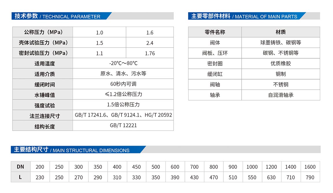 蝶形缓闭止回阀主要用于净水、原水、污水、海水等介质的供、排水管道上,安装在水泵出口处,用以截断介质的回流,消除水锤,保护管道、水泵的安全运行。其主要特点:体形小、重量轻、结构长度只有旋启式止回阀的三分之一左右。带外置阻尼油缸,缓闭性能优良,不受管道中介质的影响,阀瓣先速关后缓闭,可防止破环性水锤。橡胶软密封,结构密封性能好,耐磨损,使用寿命长。橡胶缓冲,运行平稳,无震动及噪音,比老式止回阀流阻小,有明显的节能效果。