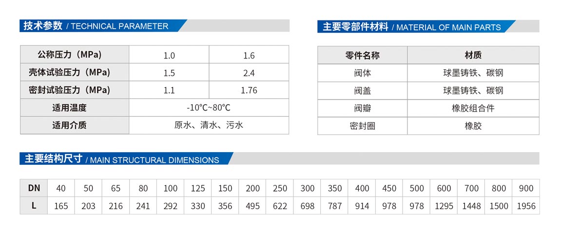 采用全流面积式设计,水头损失小,不易堆积杂物,密封采用斜板式设计,关闭行程短,阀瓣采用橡胶与钢板经高温压制而成,耐冲涮,密封性能好,产品结构简单、维护和保养方便。